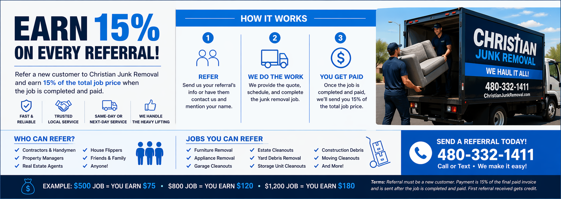 Refer them to Christian Junk Removal and earn 15% of the total job price for every completed referral.